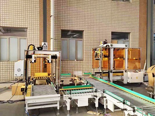 全自动伺服封箱机是采用伺服电机为主要驱动机构,针对不同纸箱的混产情况,用户可提前将所有纸箱录入封箱机内,由上位机与封箱机通讯,可实现纸箱的一键换产,一字封与工字封可任意切换和选择,尾端配有贴标和移载机构,由光电识别将不同的纸箱码到不同的托盘上,该线体配备了进口协作式机器人,立柱可升降,充分满足不同高度及垛型的需求。性能更稳定,占地面积小,成本低。