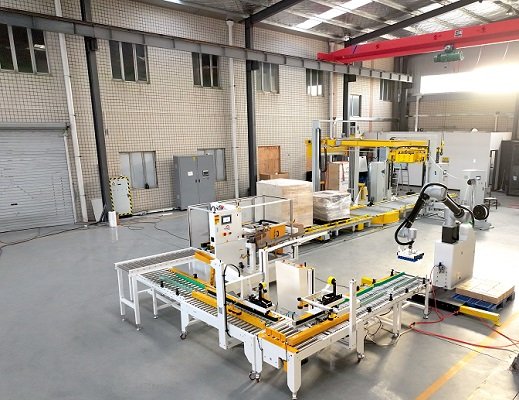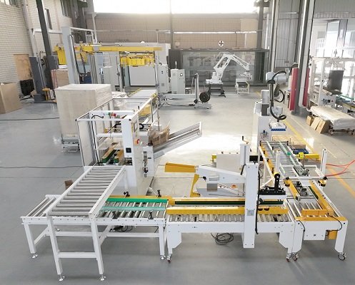 玉米面条十字封箱机是由开箱机、折盖封箱机、90度转向机构、半自动一字封箱机以及协作机器人码垛机组成,该线体根据用户现场比较紧凑的实际情况而设计,开箱机出料口高度较高,在成品纸箱上面,成品纸箱输送机2侧坐人进行装箱,抬手即可拿取空纸箱,大大减少了设备的占地面积,同时方便用户的实际操作。尾端配备协作机器人码垛机,占地面积小,成本低,双抓设计,工作效率高,特别适用食品类小纸箱的开封箱码垛包装。